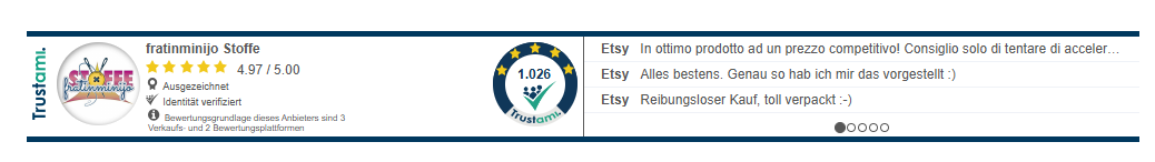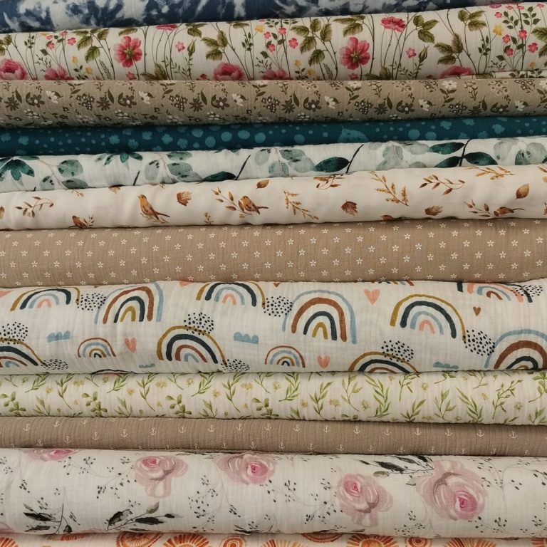 Aktuell haben wir etwa 350 Stoffe im Sortiment vorrätig. Überwiegend handelt es sich dabei um Baumwoll Jersey, French Terry und Musselin Stoffe. Dazu haben wir passende Kombi Stoffe und Bündchen.